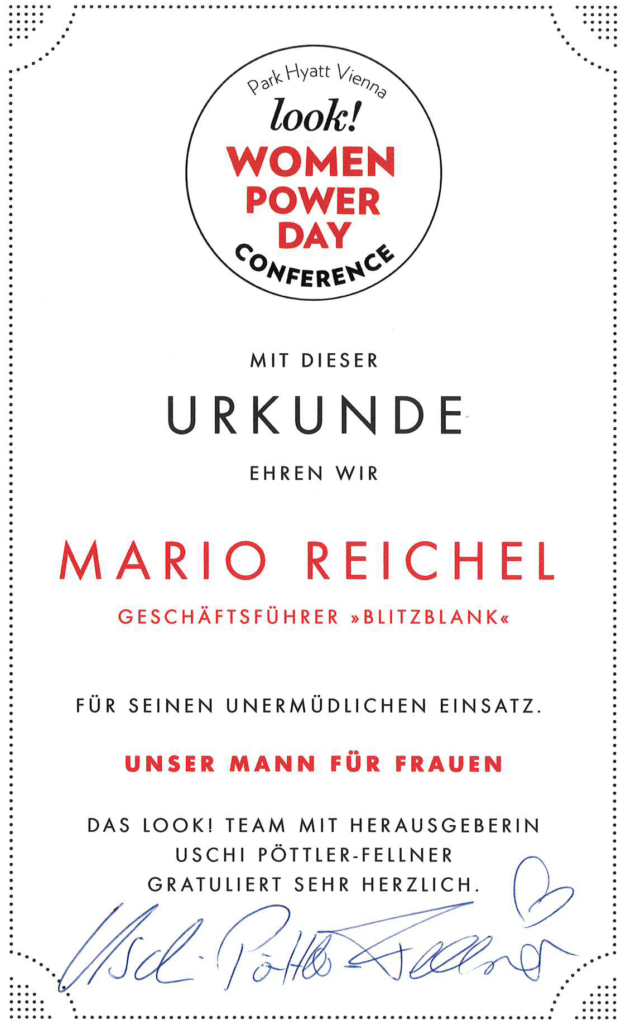 Am 7. März 2025 wurde BLITZBLANK beim look! Women Power Day im Park Hyatt Vienna für sein Engagement in der Gleichstellung ausgezeichnet. Geschäftsführer Mario Reichel nahm die Ehrung entgegen und betonte: