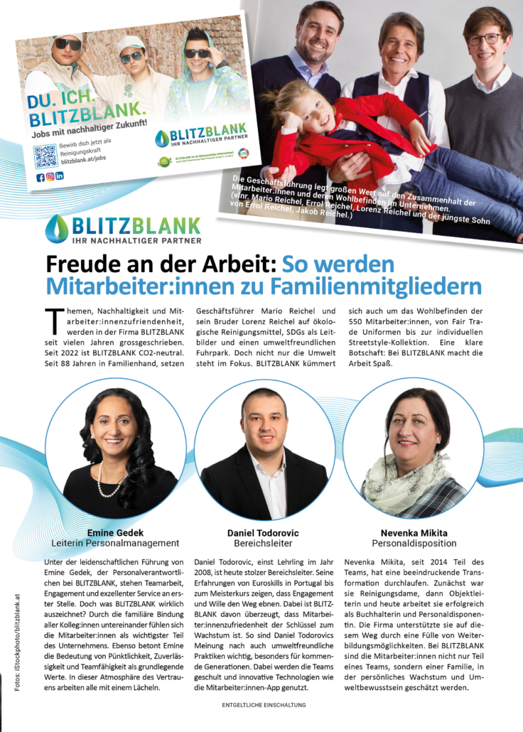 Das Familien-Unternehmen BLITZBLANK blickt auf 87 Jahre Firmengeschichte zurück. Mit seinen rund 1200 MitarbeiterInnen und dem Fachwissen, das über drei Generationen kontinuierlich ausgebaut wurde, steht der Name BLITZBLANK immer für Zuverlässigkeit und Qualität in der Reinigung mit einem Hauptaugenmerkt auf Nachhaltigkeit, Kompetenz und einer Spezialisierung in der Hygiene und Desinfektion.